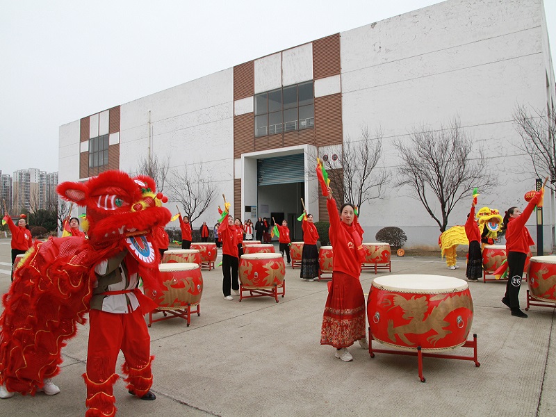 就在此時,由公司女性職工組成的美女打鼓隊閃亮登場。她們身著統一的服裝,精神飽滿,活力四射,兩只活潑的獅子在一旁隨著鼓點伴舞。