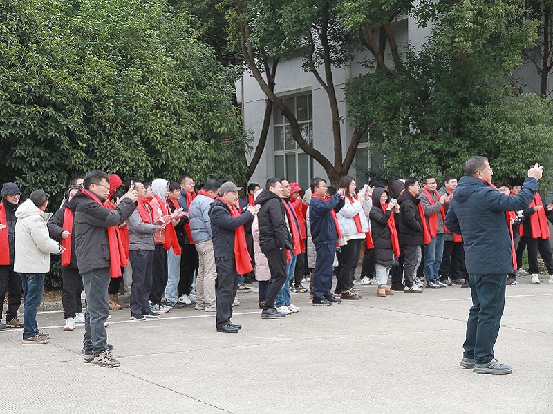 上午8:58分,隨著《開門紅》歡快的旋律響起,鼓點歡快激昂,如靈動的精靈跳躍在空氣中,瞬間點燃了現場氣氛。那富有節奏感的鼓點,仿佛在敲打著每一個人的心房,傳遞著新一年的蓬勃希望,預示著公司在2025年必將開門大吉,紅紅火火。
